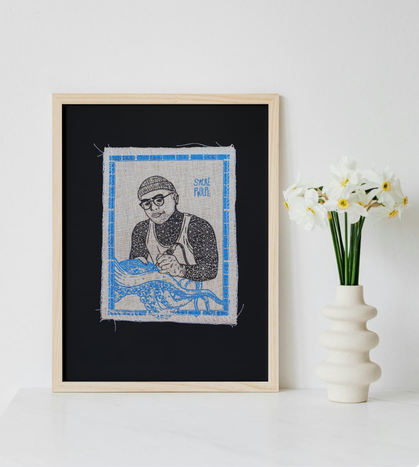 Patch sérigraphié artisanalement sur du tissu de seconde main en Ardéche