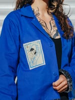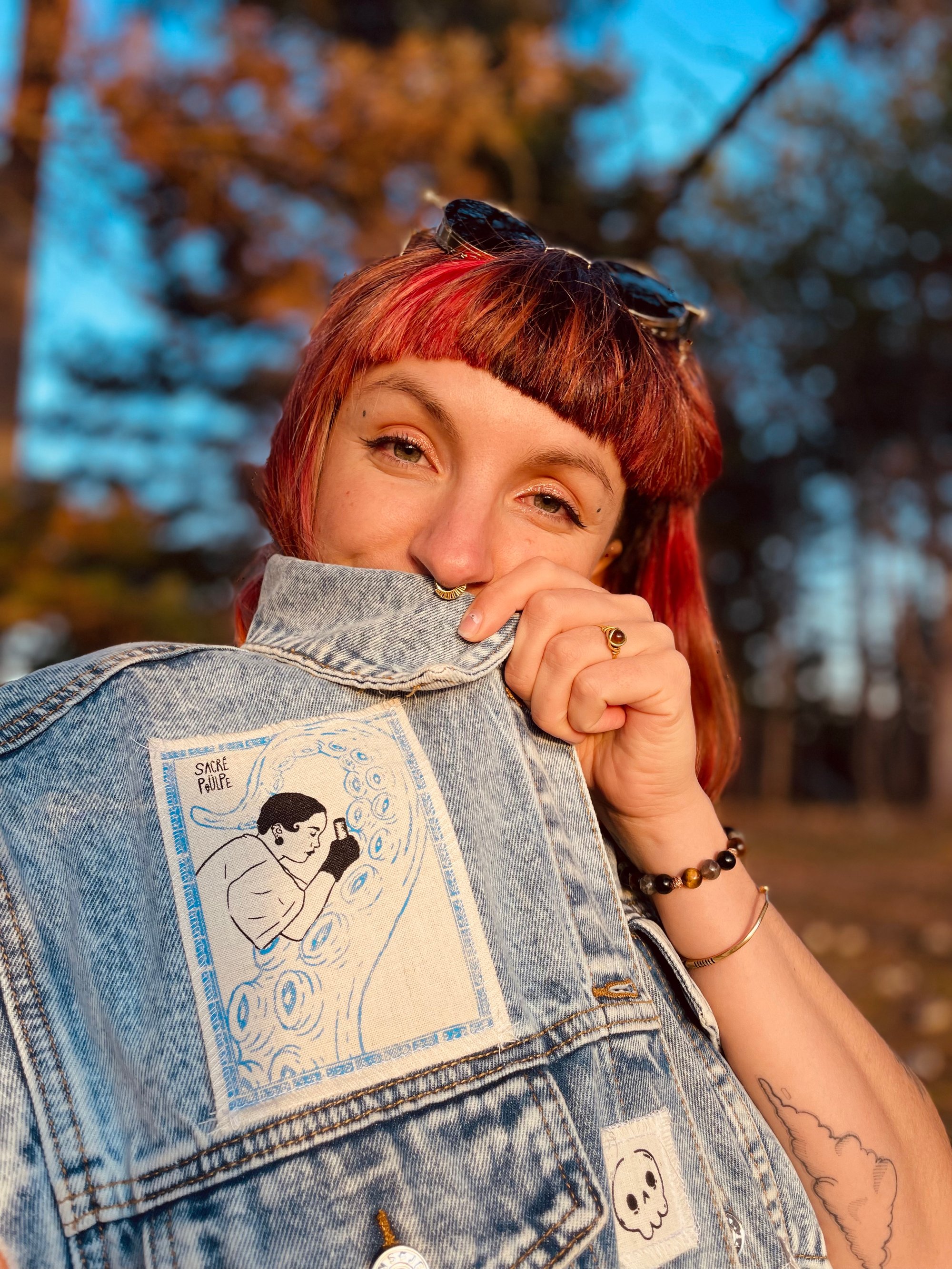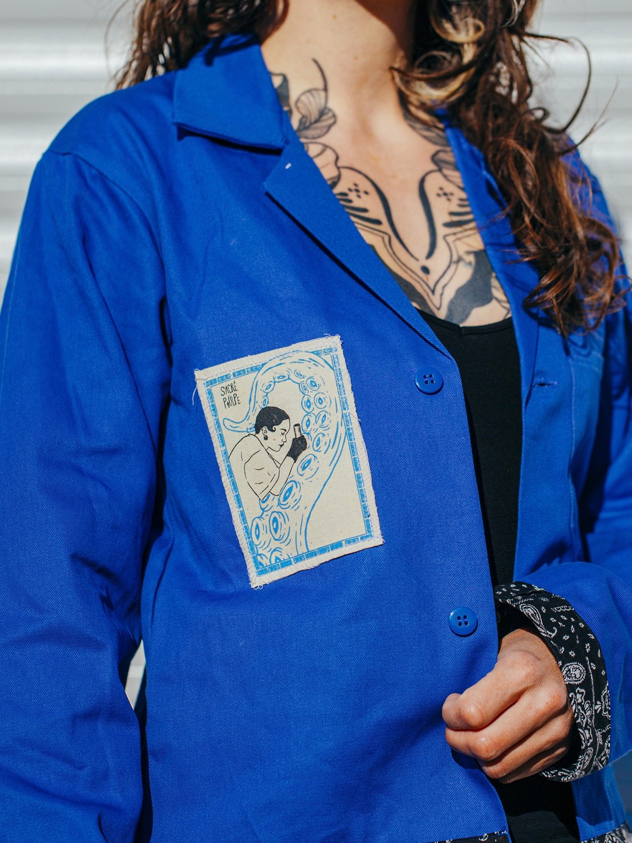 Patch sérigraphié artisanalement sur du tissu de seconde main en Ardéche