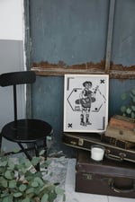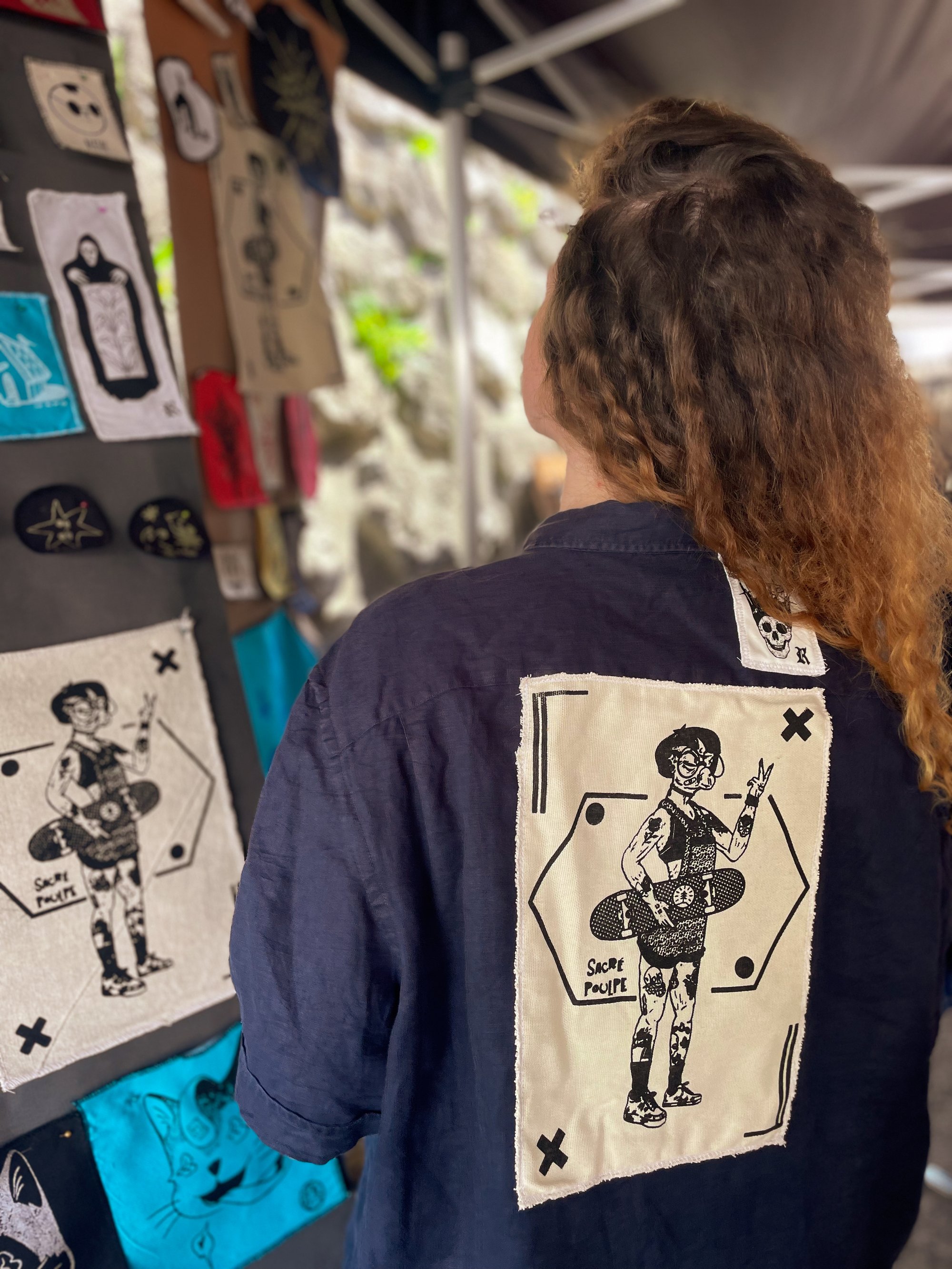 Patch sérigraphié artisanalement sur du tissu de seconde main en Ardéche