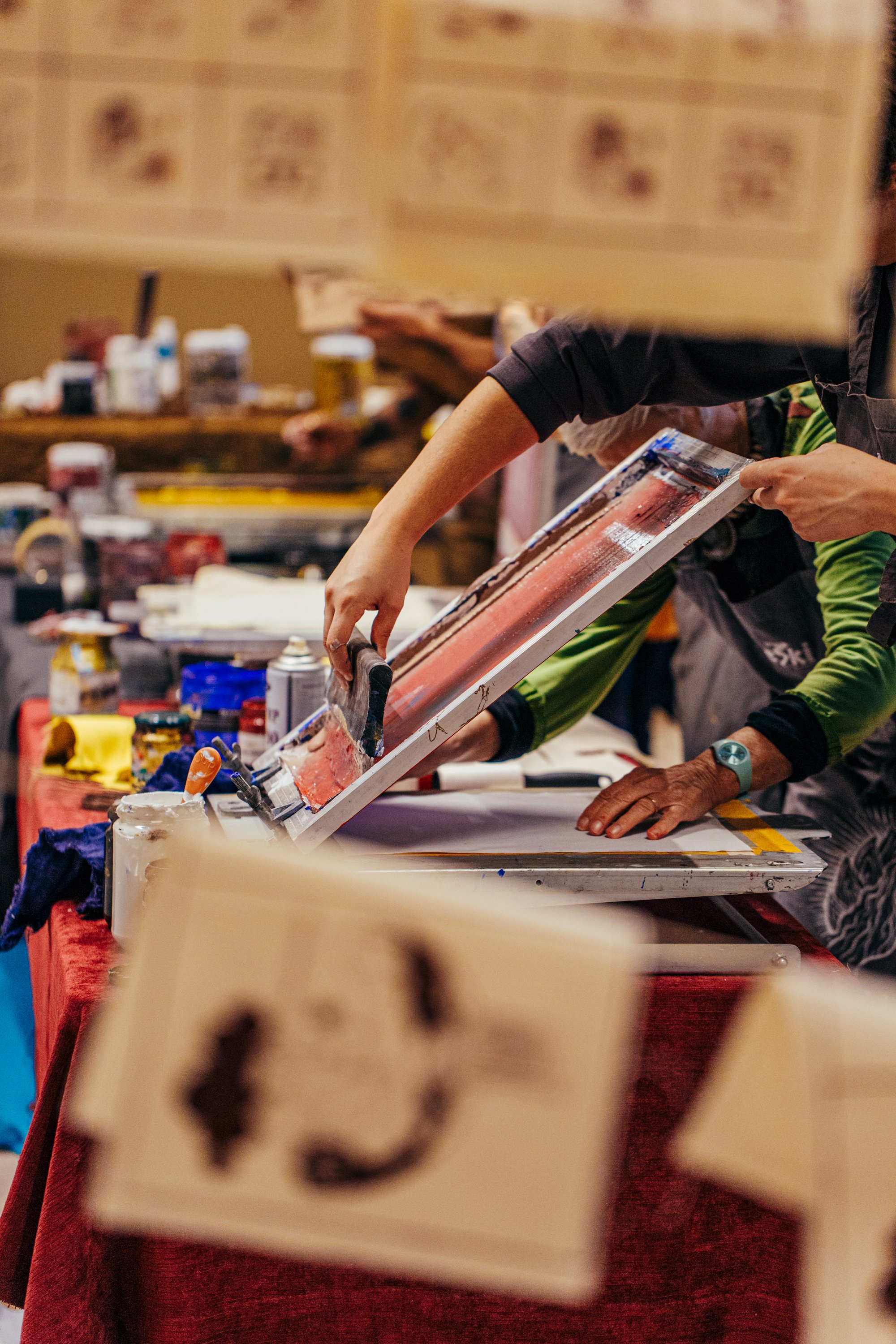 Patch sérigraphié artisanalement sur du tissu de seconde main en Ardéche